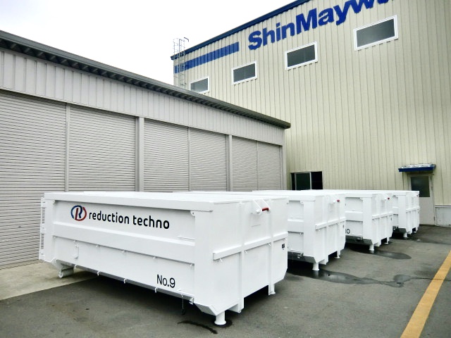 省スペースで廃棄物を効率的に処理できるコンテナの需要増に応え、リダクションテクノでは毎月4個ペースで新明和オートセールス㈱様よりコンテナを生産、納品していただいております。飛散防止、景観保護の観点からもコンテナ設置をお勧めしています。