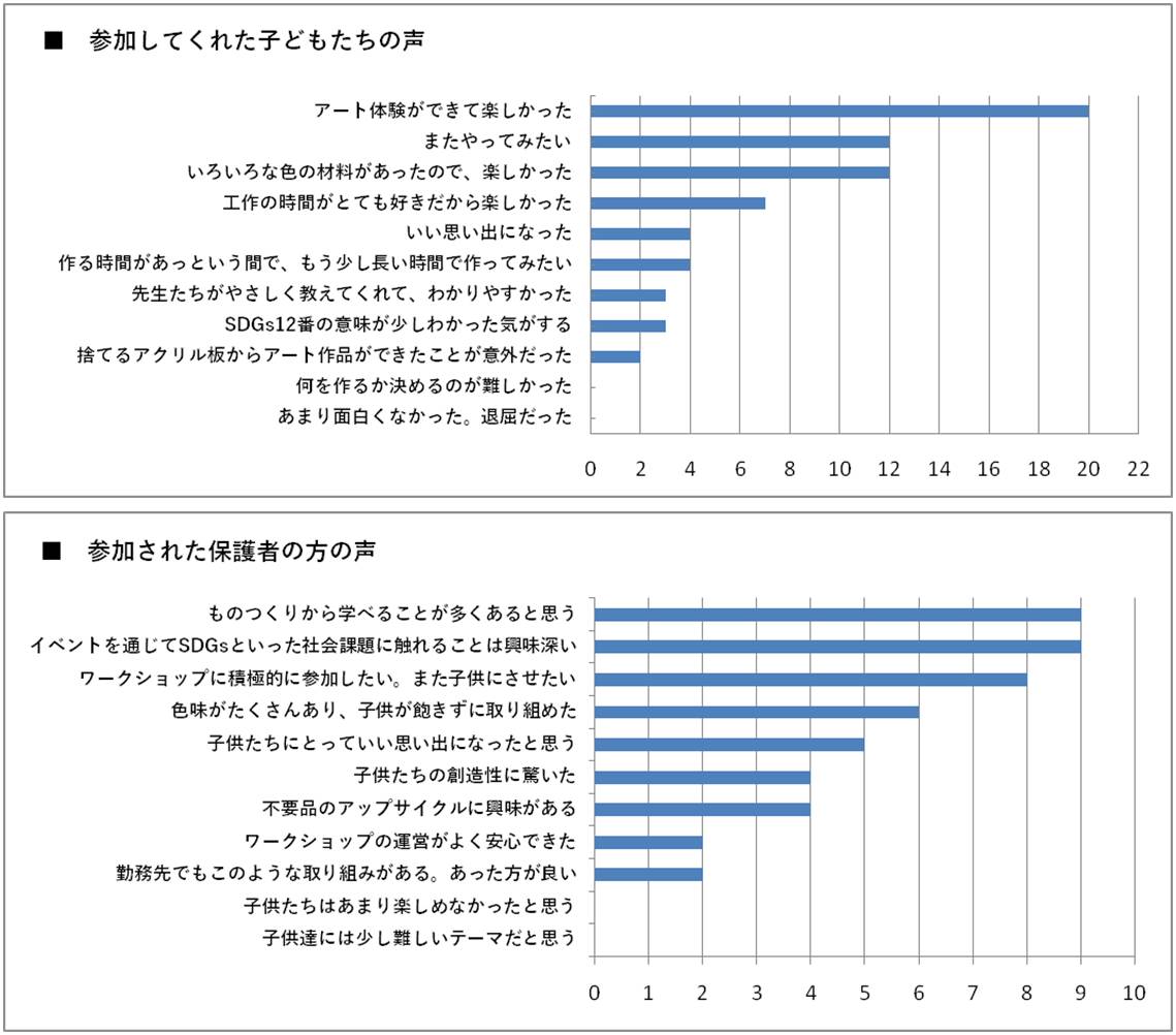 全6回のワークショップには、子ども28名と保護者の方24名にご参加いただきました。子どもたちからは「アート体験ができて楽しかった」という声があり、さらに保護者の方からも「ものづくりから学べること多くがあると思う」という好反応を得ることができました。