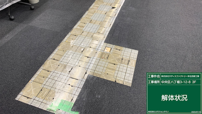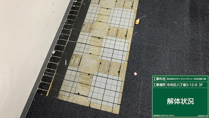 既存壁下部にあった床材撤去。下地を傷つけないように撤去作業は慎重に行います。配線等は事前に移動し作業中に断線等のトラブルを起こさないようにしています。